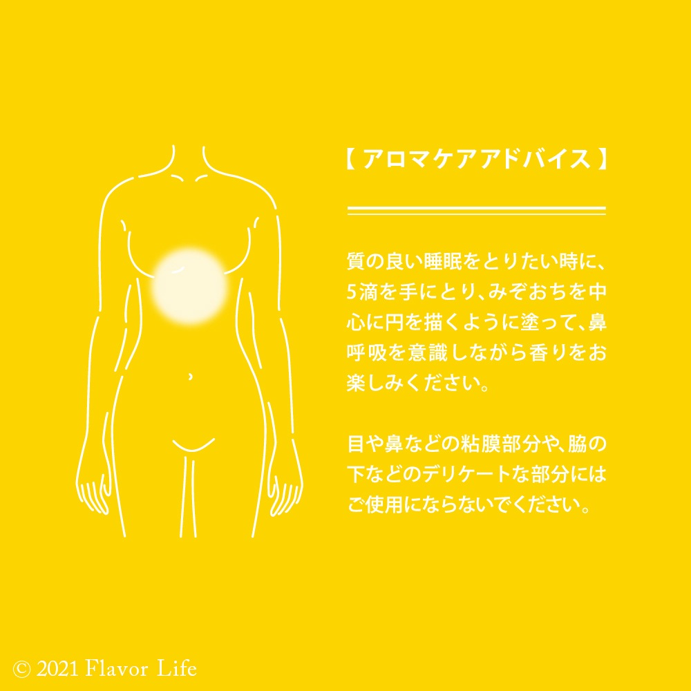 2~3滴を肌に直接塗って,鼻呼吸を意識しながら香りをお楽しみください。