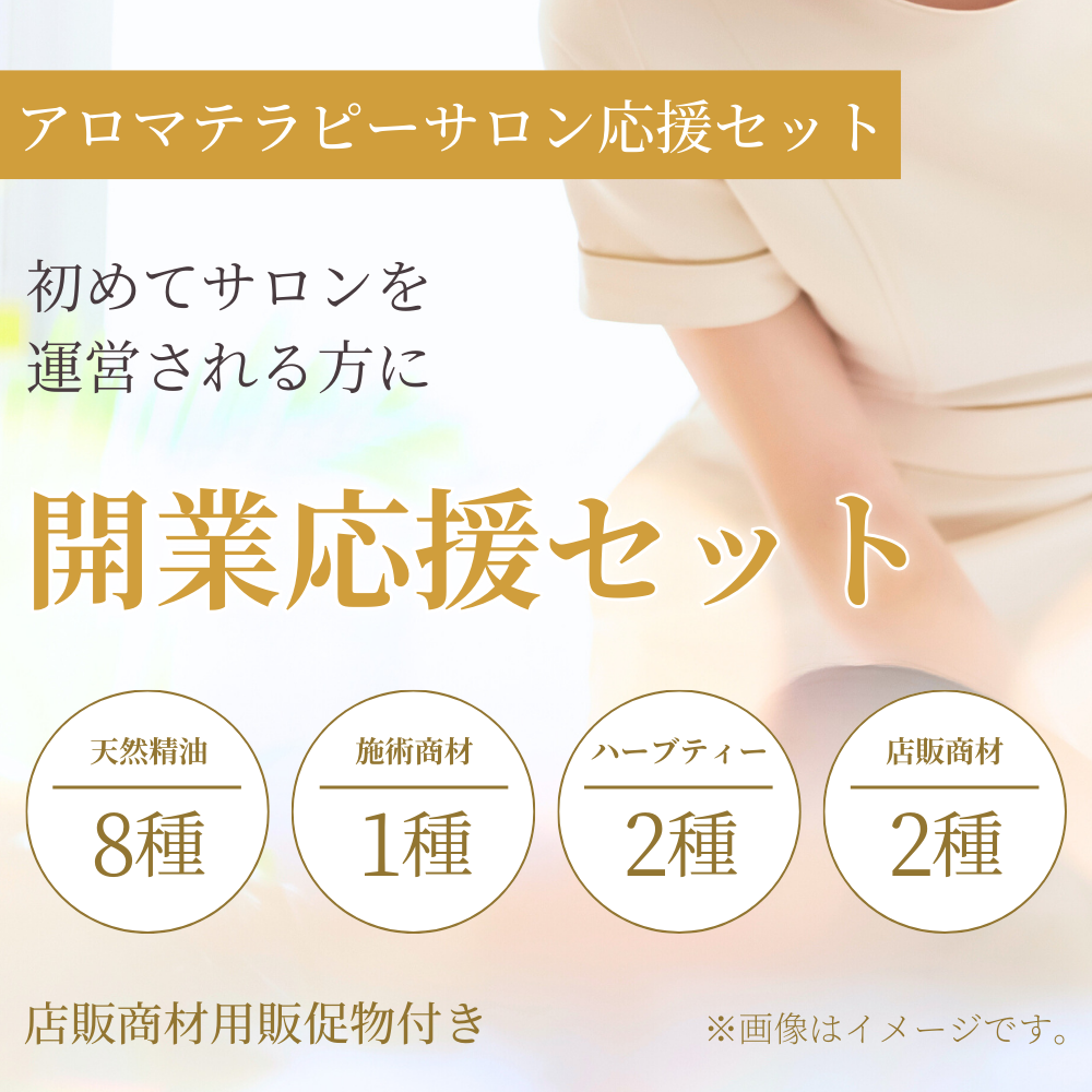 「開業応援セット」は、プロが厳選した精油・キャリアオイル・ハーブティー・物販商品までをひとまとめにした、初心者でも安心のスターターセットです。